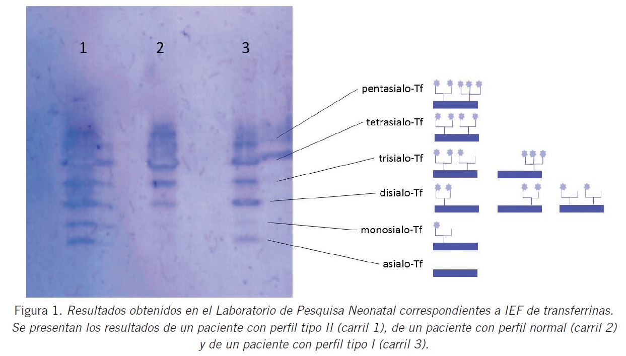 La deficiencia en la N-glicosilación determina la ausencia o disminución de ácido siálico unido a las proteínas, lo que produce cambios en la carga de la transferrina sérica. El IEF permite separar isoformas de transferrina a partir de esta deficiencia y de la alteración en la carga de esta molécula. Si bien es una técnica cualitativa y hoy en día han surgido nuevas metodologías que permiten una identificación más sensible de las isoformas (electroforesis capilar, HPLC, espectrometría de masa), el IEF sigue siendo una técnica útil como primer screening (7) (8) (9).