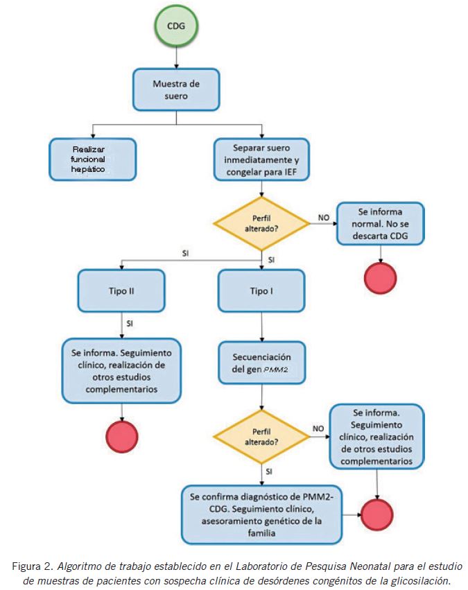 Abstract: Congenital disorders of glycosylation are a group of genetic, autosomal and recessive diseases, first reported by Jaeken in 1980. These include defects in N- and O-glycosilation of proteins and lipids. Most N-glycosylation defects are multi-organ diseases with neurological involvement. Therefore, the implementation of a screening methodology is necessary to contribute in the diagnosis. Newborn Screening Laboratory included the transferrin isoelectrofocusing as a screening method and, subsequently, PMM2 gene sequencing as a confirmatory method for samples with altered screening. The present study shows the experience and results obtained between November 2017 and December 2018, which made it possible to establish an algorithm that positively impacted in the diagnosis of these patients.