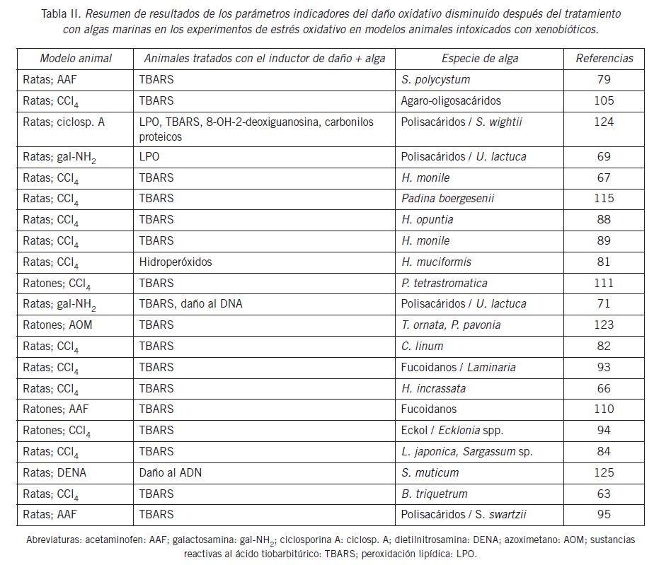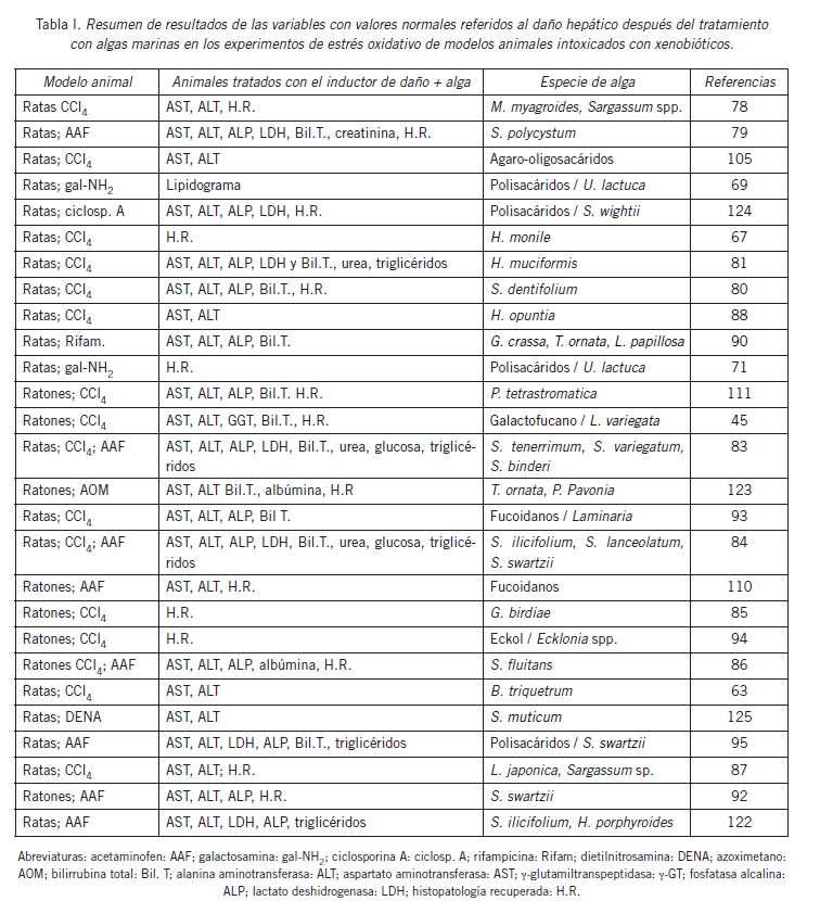 La mayoría de los trabajos demostraron el daño oxidativo por xenobióticos y la posterior recuperación de los animales tratados con algas marinas a través de las actividades de las enzimas ALT y AST. Diferentes autores han demostrado las propiedades hepatoprotectoras y antioxidantes en extractos de las algas Hypnea muciformis, Gracilaria birdiae, B. triquetrum, Chaetomorpha linum, Myagropsis myagroides, Laminaria japonica, Ulva reticulata Gracilaria crassa y Sargassum spp. (63) (69) (78) (79) (80) (81) (82) (83) (84) (85) (86) (87), en fracciones ricas en polifenoles de las algas H. opuntia y H. monile (38) (88) (89) y con moléculas aisladas de algas como polisacáridos, florotaninos y ficoesteroles (81) (90) (91) (92) (93) (94) (95) (96). En estos trabajos se ha encontrado una relación directa entre la actividad antioxidante y las propiedades hepatoprotectoras, evidenciada en la recuperación del animal a nivel molecular con valores normales de enzimas marcadoras y analitos.