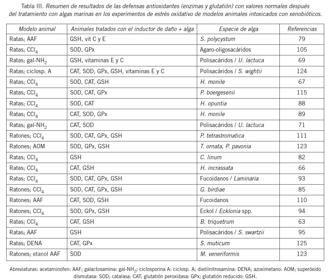 Silva et al. (88) observaron que la administración de una fracción fenólica de H. opuntia provocaba una sobreexpresión de las enzimas antioxidantes CAT, SOD y GPx y esto explicaba sus propiedades hepatoprotectoras. En otras investigaciones (63) (66) (67) (89) observaron una sobreexpresión de los genes de las enzimas CAT, SOD y GPx del tejido hepático mediante la técnica de RT-PCR en las ratas tratadas con las algas marinas B. triquetrum, H. incrassata y H. monile. En la Tabla III se puede apreciar un resumen de los resultados de las enzimas y metabolitos antioxidantes de los experimentos de estrés oxidativo con los animales tratados con las algas marinas.