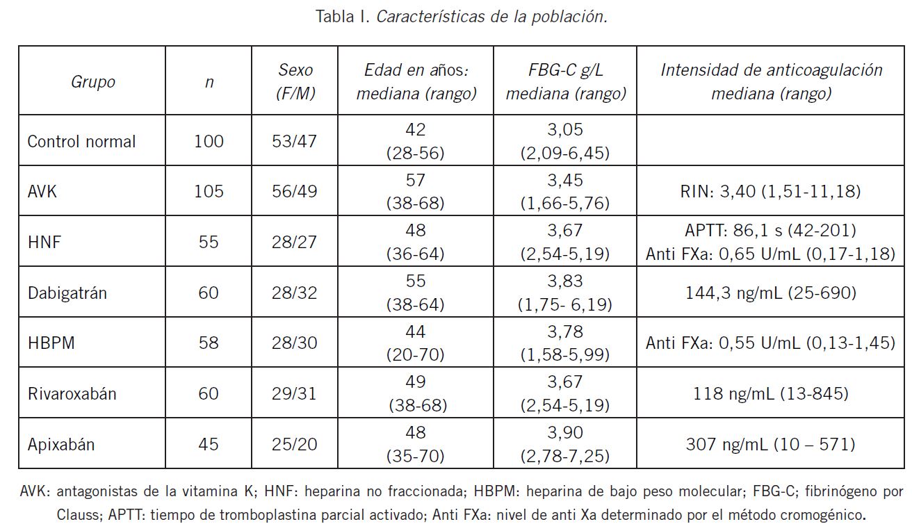 Estuvo constituida por 383 muestras consecutivas de pacientes mayores de 18 años, con tiempo de protrombina (PT) y tromboplastina parcial activada (APTT) normales previo al inicio de la anticoagulación: 105 recibían antagonistas de la vitamina K (AVK) con relación internacional normatizada (RIN) mayor de 1,5 (pacientes ambulatorios); 55 recibían HNF a dosis anticoagulante (pacientes internados por enfermedad tromboembólica), 58 HBPM con una actividad anti Xa medida en plasma mayor de 0,2 U anti Xa/mL (36/59 pacientes internados), 60 recibían rivaroxabán, 60 dabigatrán y 45 apixabán (todos pacientes ambulatorios). Como grupo control se procesaron 100 muestras de donantes de sangre (CN). La Tabla I muestra las características de la población. El 75% de los pacientes tomaban anticoagulantes orales por fibrilación auricular y el 25% restante por tromboembolismo venoso. Los pacientes que recibían HNF por síndrome agudo coronario y tromboembolismo venoso estaban todos internados.