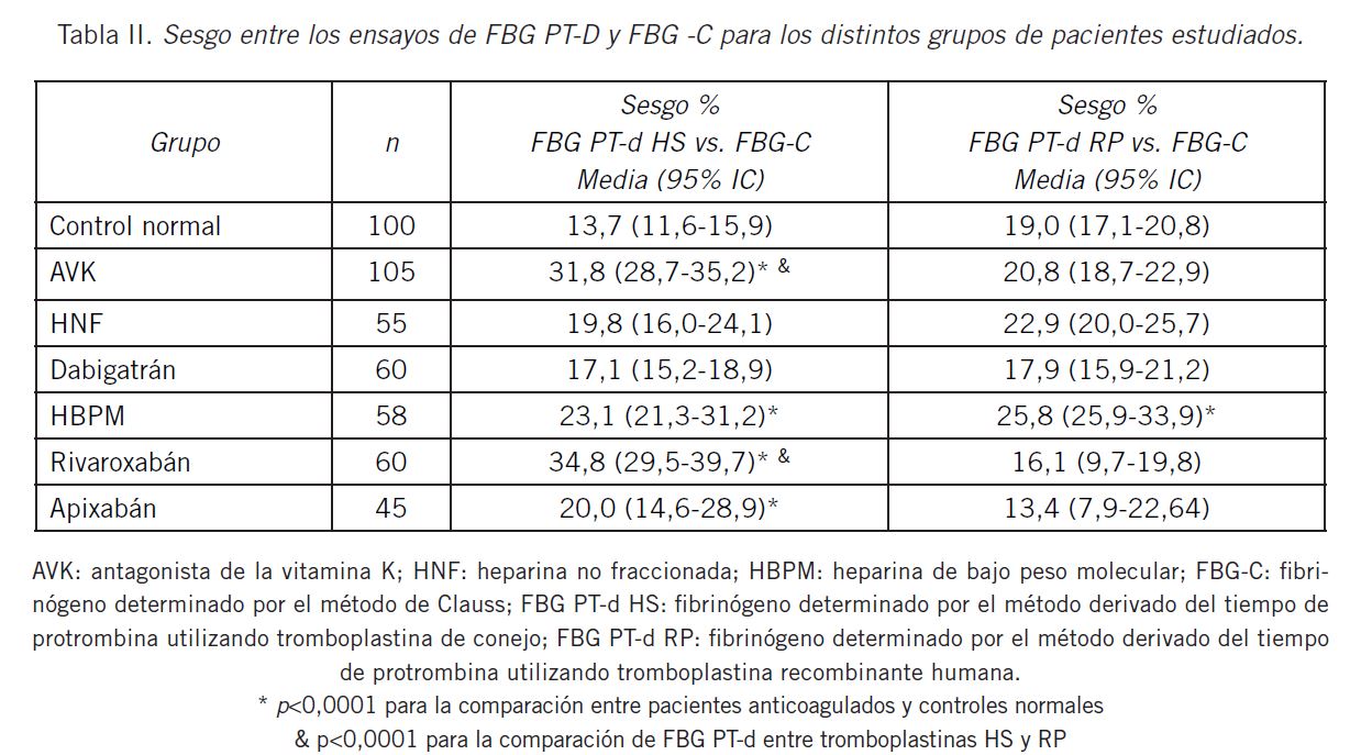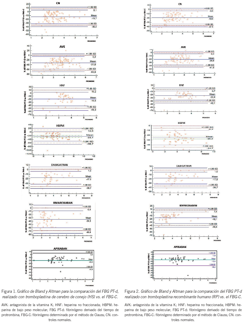 En los casos en que los plasmas contenían dabigatrán, el FBG-C fue significativamente menor cuando el ensayo se realizó con un reactivo que contenía menos de 100 UI/mL de trombina, debido a que el dabigatrán presente en la muestra bloquea parcialmente la trombina del reactivo (datos no mostrados). Por esta razón, para hacer las comparaciones con el FBG PT-d se utilizaron las concentraciones de FBG medido por el método de Clauss con concentraciones de trombina de 100 UI/mL.