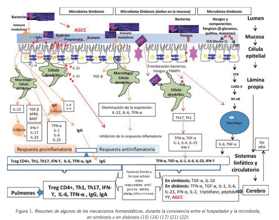 En la Figura 1 se resume solo una parte del complejo mecanismo, referido por varios autores, destinado a mantener el control homeostático recíproco durante la convivencia entre el hospedador y la microbiota, así como el alcance de este mecanismo en otros sistemas de órganos que componen los ejes con el intestino (15) (16) (17).