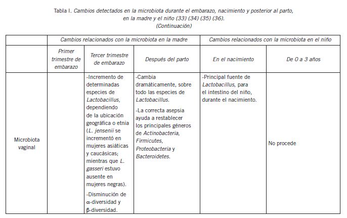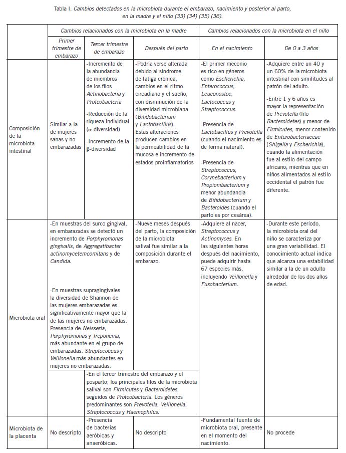 En la revisión realizada se han encontrado, fundamentalmente, referencias relacionadas con la evolución del patrón bacteriano durante la gestación y nacimiento del niño. En la Tabla I se muestra un resumen de algunos cambios en el patrón bacteriano, descriptos durante la gestación, posparto y primeras etapas de crecimiento del niño.