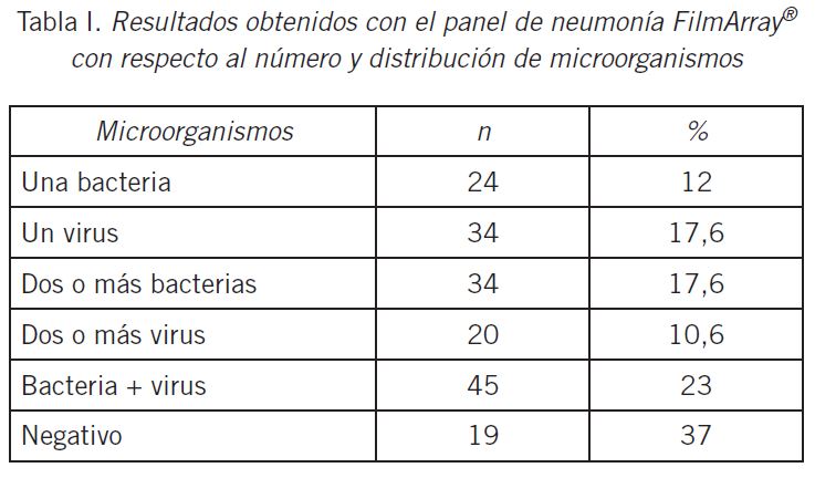 El sistema de FilmArray® (BioFire ®, Salt Lake City UT, EE.UU.) con su panel de neumonía (PP) es una reacción en cadena de la polimerasa (PCR) múltiple que incluye a 26 microorganismos frecuentemente relacionados con neumonía y a 7 genes de resistencia; los resultados se obtienen a partir de muestras respiratorias bajas (esputo, lavado broncoalveolar broncoscópico y no broncoscópico o secreciones traqueales) en 1 h con un tiempo de preparación de las mismas de 2-3 min y se presentan en forma semicuantitativa (copias/mL) para las bacterias que usualmente producen neumonía, a excepción de Legionella pneumophila, Chlamydia pneumoniae y Mycoplasma pneumoniae y de virus, donde el resultado fue cualitativo (positivo o negativo).