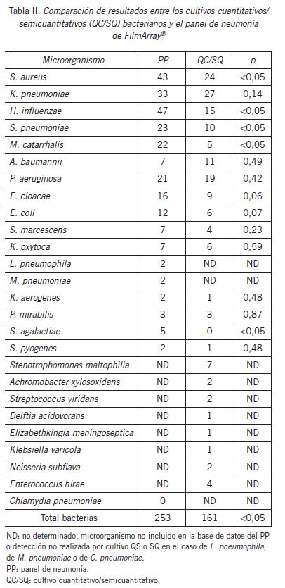 Sobre un total de 277 agentes bacterianos, el PP identificó a 253 (91,3%) y 161 (58,1%) fueron aislados en cultivos QC incluyendo 20 aislados de especies que no estaban incluidas en la base de datos y por lo tanto no fueron detectadas por el PP. En 4 casos (2 L. pneumophila y 2 M. pneumoniae) la detección fue solo por el PP dado que no se realizaron otros métodos para poder documentar estas bacterias. En 157 (56,67%) agentes bacterianos la detección fue concordante por ambos métodos y el PP detectó 1,57 (253/161) más de agentes bacterianos que el cultivo. La diferencia fue estadísticamente significativa (p≥0,05) en lo que respecta a S. pneumoniae, S. aureus, H. influenzae, M. catarrhalis y S. agalactiae.
