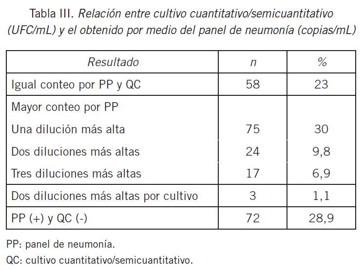 En la Tabla III se muestra la relación entre el resultado del PP (copias/mL) y el cultivo cuantitativo/semicuantitativo (UFC/mL).