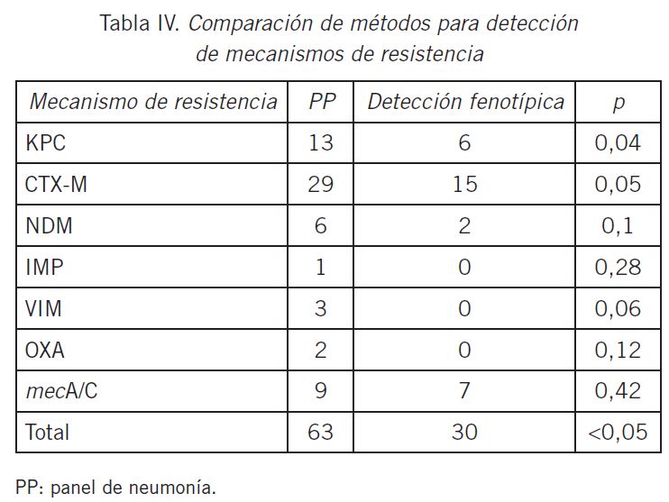 En la Tabla IV se presentan los resultados comparativos entre métodos fenotípicos de detección de mecanismos de resistencia y los del PP.