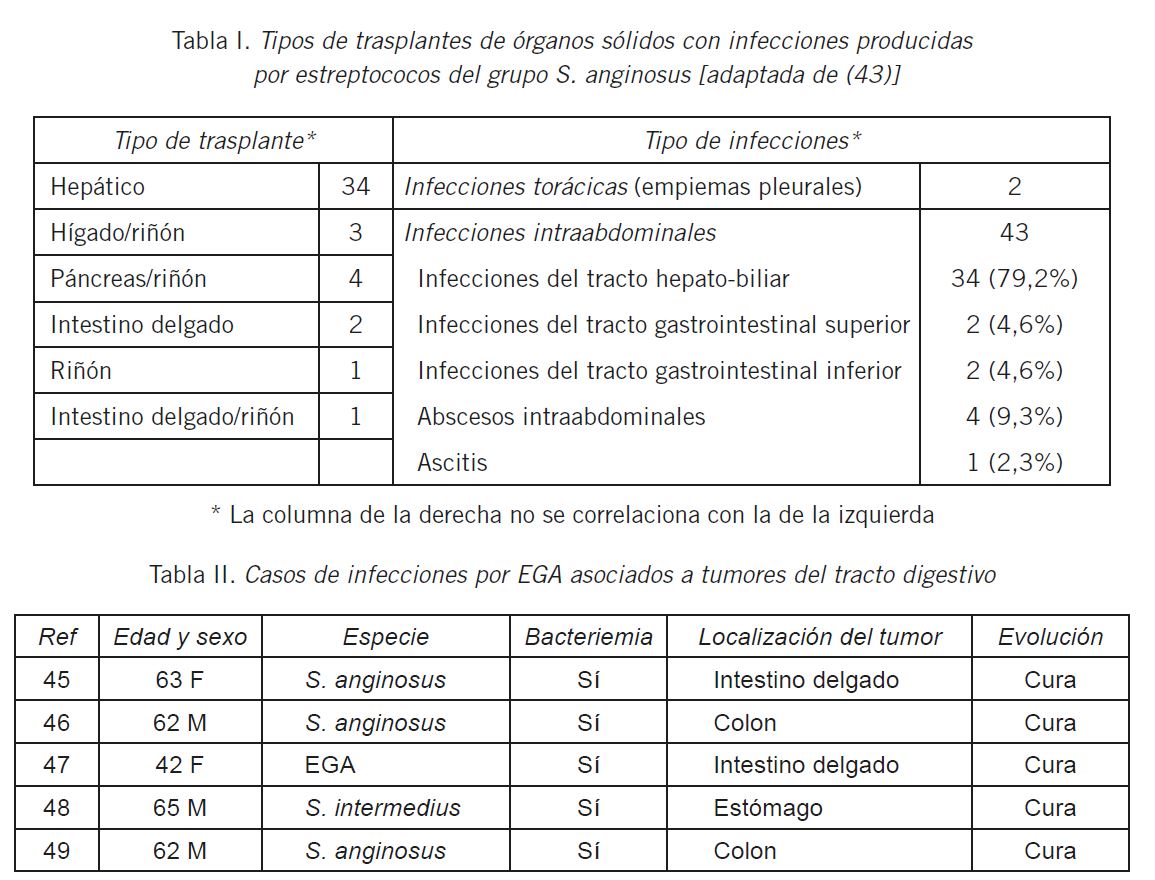 Los EGA también han sido encontrados con cierta frecuencia como agentes etiológicos de abscesos intraabdominales en receptores de trasplantes de órganos sólidos, en el 61% de los casos como parte de microbiota mixta (Tabla I) (43).