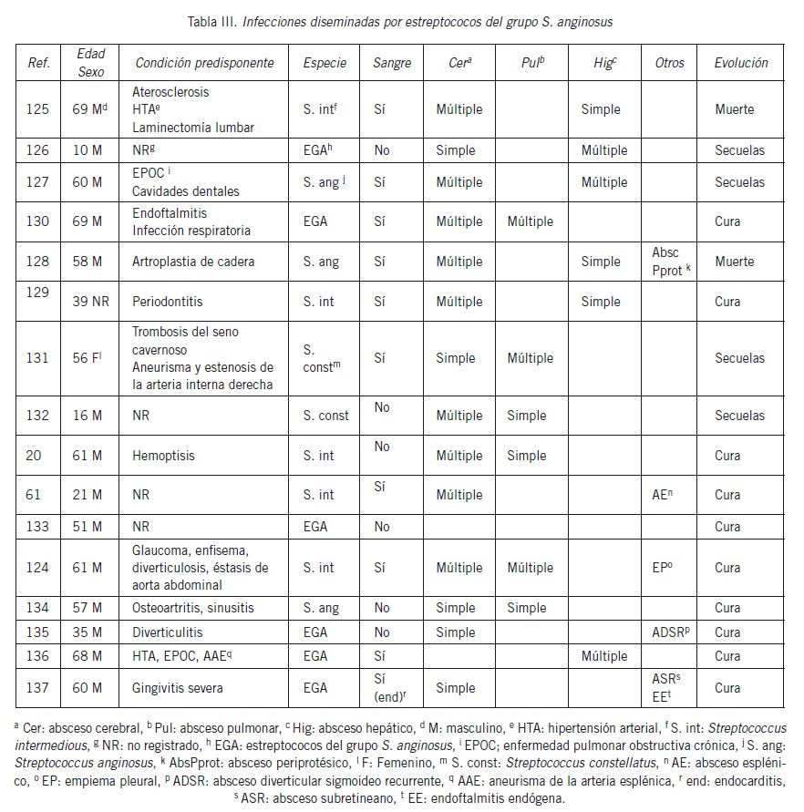 Simone et al. realizaron una revisión de las infecciones diseminadas por EGA, a propósito de un caso de un varón de 61 años con algunos factores predisponentes y con múltiples abscesos cerebrales y hepáticos sumados a un empiema pleural (124). Se relataron otros casos de coexistencia de abscesos hepáticos y cerebrales (125) (126) (127) (128) (129), abscesos cerebrales y pulmonares (20) (130) (131) (132) (134) e incluso un caso de múltiples abscesos cerebrales sumados a un absceso esplénico (61) (Tabla III). Estas infecciones múltiples diseminadas pueden dejar importantes secuelas o incluso producir la muerte de los pacientes.