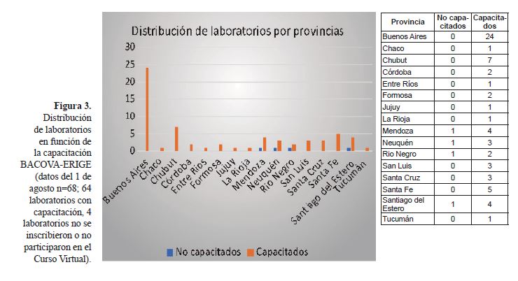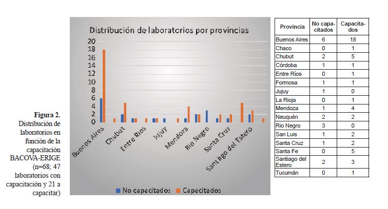 En primera instancia, los laboratorios se clasificaronen función de la capacitación en la metodología BACOVA-ERIGE. Los bioquímicos de 47 de los laboratorios inscriptos (n=68) estaban capacitados en BACOVA. Por ello, a través del Programa de Salud Sexual y Reproductiva de la Fundación BioquímicaArgentina (PROSAR-FBA) se formalizó una capacitación virtual para los bioquímicos participantes de la Red que no la tenían, además de inscribir a otros participantes (Figura 2).