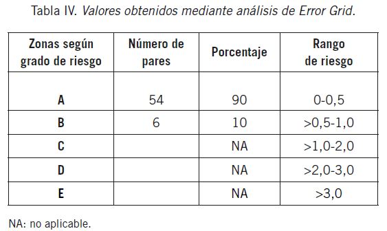 Con el fin de evaluar la exactitud clínica se llevó a cabo el análisis de Error Grid (Fig. 4) y luego se volcaron los resultados obtenidos en una cuadrícula de error (Tabla IV).