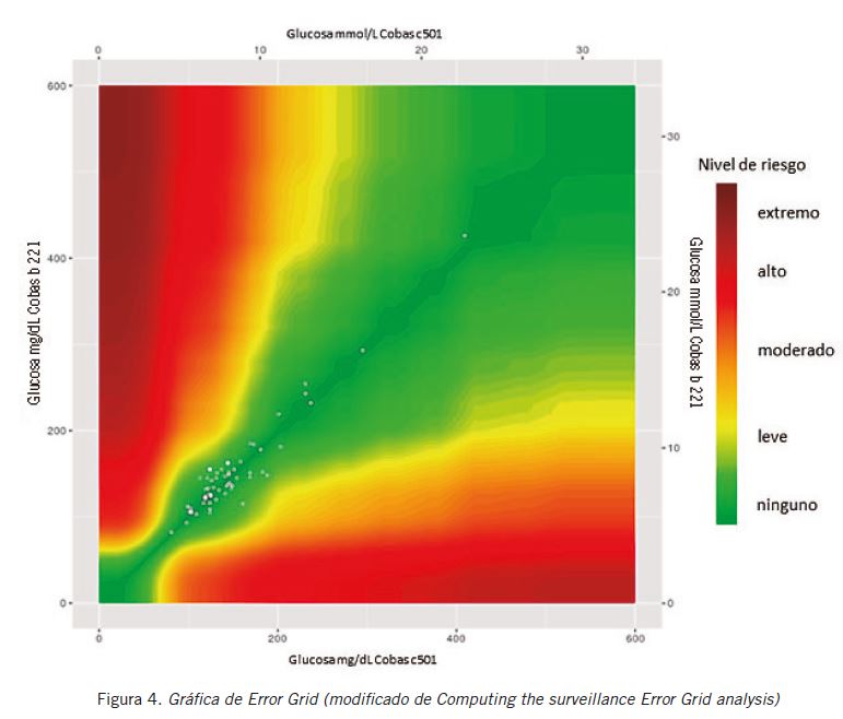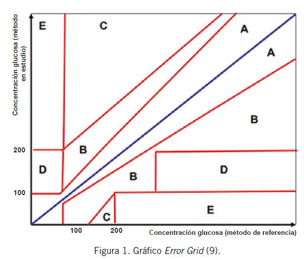 Al contemplar los objetivos analíticos propuestos por los organismos internacionales, los datos preliminares de los valores comparados del presente estudio no alcanzaron los resultados óptimos. Aún las exigencias más laxas no pudieron cumplirse, como las de la ISO 15197, que determinan que el 100% de los valores del sistema evaluado se deben encontrar dentro del 20% respecto del valor de referencia para concentraciones de glucosa mayores de 75 mg/dL. Se trazaron los resultados emparejados de ambos equipos mediante la cuadrícula de Error Grid en la cual se determinó qué porcentaje de puntos de datos caían en cada zona representando un grado de riesgo de un resultado clínico adverso.A través de dicha cuadrícula, se pudo evidenciar que la mayoría de las determinaciones se encontraban en la categoría considerada clínicamente adecuada, como está descripto en la bibliografía. Para dar cumplimiento a este requisito el 99% de las mediciones debían encontrarse en las zonas A y B de la cuadrícula 1 (12). Es decir, que los resultados serían aceptables a la hora de la toma de una decisión clínica, debido a que se encontraban en la zona de bajo riesgo o considerada con menor potencial de daño en el diagnóstico del paciente o de error terapéutico.