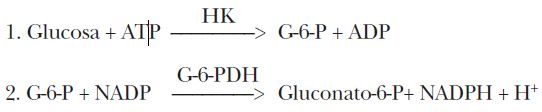 La determinación de glucosa en el Cobas c 501 se considera el método de referencia, en el cual se mide actividad catalítica de la hexoquinasa (HK) mediante una reacción enzimática a través de un lector UV. La HK cataliza la fosforilación de la glucosa a glucosa-6-fosfato por medio de ATP. La glucosa-6-fosfato deshidrogenasa oxida la glucosa-6-fosfato en presencia de NADP a gluconato-6-fosfato. La producción de NADPH origina un aumento de absorbancia a 340 nm. El incremento de absorbancia a esta longitud de onda es directamente proporcional a la concentración de glucosa.