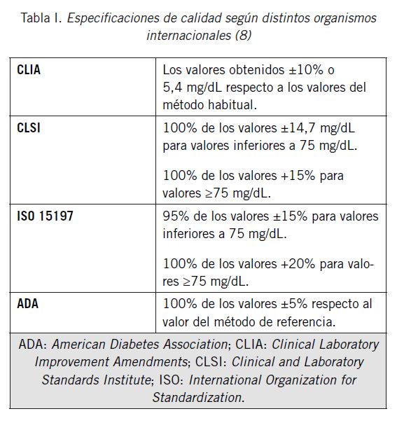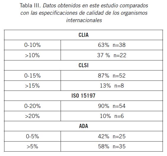 En base a las especificaciones del CLSI para concentraciones superiores a 75 mg/dL, se encontró que el 87% de los valores estaban contenidos dentro del 15% respecto a los valores del método de referencia, mientras que el 13% de los resultados restantes presentaron valores superiores al 15% respecto del método de referencia. Según el criterio de CLIA, el 63% de los valores cumplían con el objetivo del 10% respecto del método de referencia, mientras que el 37% de los valores superaban dicho objetivo. Al tomar el criterio de la Norma 15197, de la Organización Internacional de Estandarización (ISO), solo el 90% de los valores superiores a 75 mg/dL estaban contenidos en el ±20% respecto al valor de referencia, mientras que solo un 42% de los valores cumplían con la especificación de ±5% de la ADA.