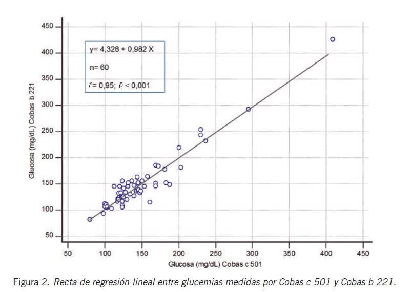 La comparación de dos sistemas permite analizar si el equipo en estudio es apropiado y capaz de realizar las determinaciones de glucosa con características similares al equipo de referencia. En este caso, previamente se verificó en el mismo el cumplimiento de los parámetros de calidad. Mediante dicha expectativa, se evaluó el sistema de medición Cobas b 221 frente al sistema de referencia, Cobas c 501. En este estudio, el analizador de gasometría presentó una buena linealidad dentro del rango estudiado con una pendiente cercana a 1, además de una correlación aceptable (r=0,95) respecto al sistema de referencia, similar a lo descripto por Fernández de Liger et al. (10).