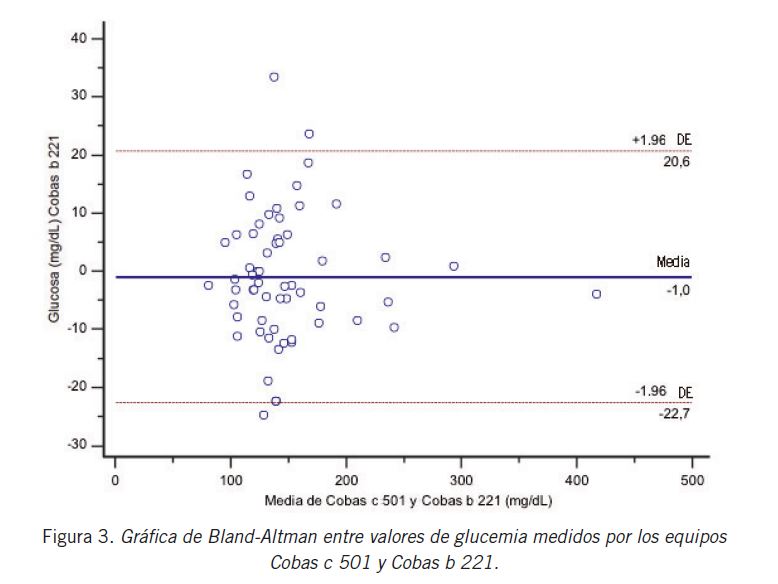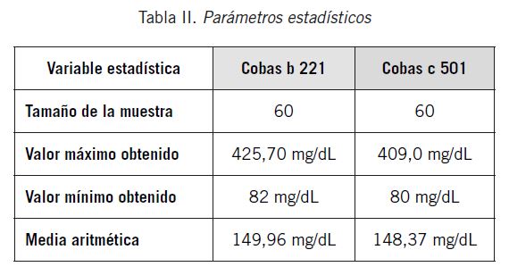 Se incluyó un total de 60 pacientes; la glucemia media en sangre total medida en el equipo Cobas b 221 fue de 149,96 mg/dL (rango: 82-425,70 mg/dL), mientras que la glucemia media en suero medida en el equipo Cobas c 501 fue de 148,37 mg/dL (rango: 80-409 mg/dL). No se encontraron valores extremos en la determinación de glucosa en ambos métodos (Tabla II).