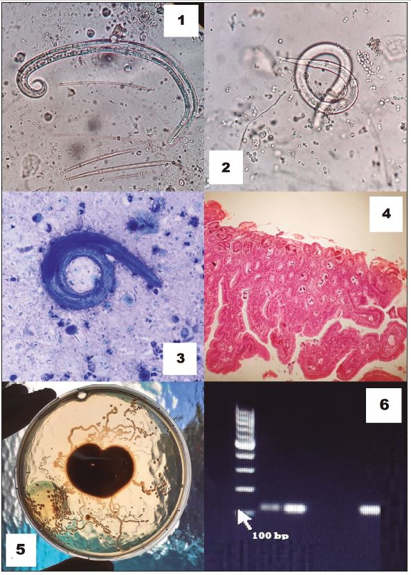 Ocasionalmente, el estudio histopatológico de biopsias, piezas quirúrgicas o de necropsias, en particular de intestino delgado, revela la presencia de larvas parasitarias en los cortes histopatológicos teñidos con la técnica de hematoxilina eosina (Fig. 4).