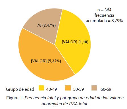Resumen: El antígeno prostático específico (PSA) en circulación se encuentra ligado a la alfa-1-quimiotripsina y una pequeña fracción circula de manera libre (PSAl). Se valoró la utilidad clínica del PSA total (PSAt) y el índice de PSA libre para la detección de cáncer prostático en pacientes asintomáticos. Se cuantificó el PSAt, el PSAl y el índice de PSAl en 364 pacientes estratificados por grupo de edad. La frecuencia de valores anormales de PSAt fue del 8,79% (32/364). El grupo de 50-59 años presentó la mayor incidencia de resultados anormales (19/32). No hubo diferencia estadísticamente significativa entre PSAt y el índice de PSAl (p<0,05). El índice PSAl puede potencializar el valor del PSAt para determinar la presencia o ausencia de cáncer prostático. Un índice superior a 0,24 ng/mL puede ayudar a evitar o posponer la indicación de biopsia, principalmente cuando los valores de PSAt están entre 4 y 10 ng/mL.