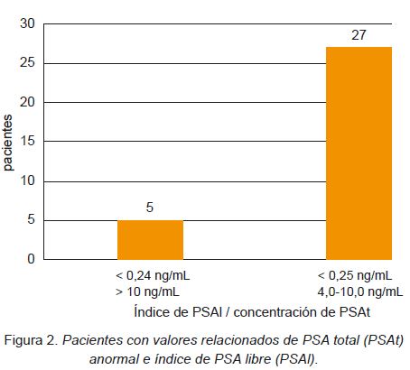 Es preciso destacar que, desafortunadamente, no se tuvo la oportunidad de realizar estudios histológicos por tratarse de una unidad médica de atención primaria. Sin embargo, se sugirió y se puso en alerta al clínico para que revalorara si el paciente requería el estudio histológico. Éste se realizó en el nivel de atención médica correspondiente, principalmente en los 5 pacientes que presentaron un PSAt superior a 10 ng/mL y un índice de PSAl por debajo de 0,24 ng/mL.