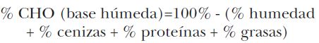 El porcentaje de hidratos de carbono se obtiene por la diferencia de los valores porcentuales de humedad, proteínas, lípidos y cenizas restados al 100% (17).