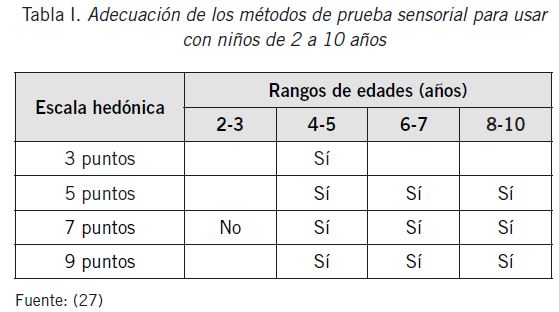 Se incluye una serie de pruebas afectivas en las que el juez expresa y manifiesta su respuesta subjetiva ante el producto evaluado, indicando si le gusta o le disgusta, si lo acepta o la rechaza (25). Las personas que participan no requieren de entrenamiento alguno, solo deben desear evaluar el producto (23). Los niños de 3-6 años de edad son capaces de expresar su grado de gusto por las muestras de alimentos usando escalas hedónicas de 3, 5 o 7 puntos (26). Estas se muestran en la Tabla I.