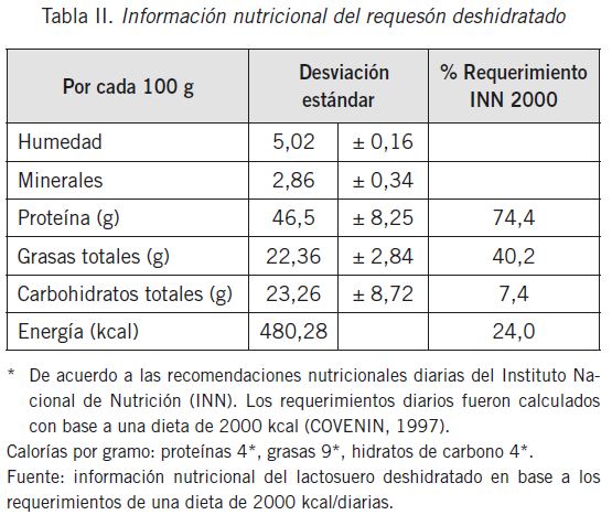 El desarrollo de esta investigación se centró en generar una fórmula artesanal a base de lactosuero, capaz de cubrir los requerimientos nutricionales de los niños en sus diferentes etapas de desarrollo. Por ello, resulta importante conocer el aporte nutricional del requesón deshidratado desarrollado. En la Tabla II se presenta la información nutricional correspondiente a 100 g de producto de requesón deshidratado. Se pudo determinar que éste contenía un aporte de proteínas del 46,5%, seguido por los hidratos de carbono con 23,26% y grasas con 22,36%.