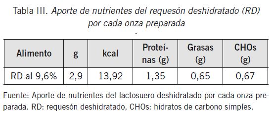 En la Tabla III se presenta el aporte de nutrientes del requesón deshidratado (RD) por cada onza preparada. Se tomaron en cuenta para la preparación de la dilución las indicaciones del Departamento de Fórmulas Lácteas y Soporte Nutricional del Instituto Autónomo Hospital Universidad de los Andes (IAHULA), Mérida- Venezuela. Se puede señalar que utilizando menos gramos del requesón deshidratado diluido al 9,6% (2,9 g) se obtiene un mayor aporte de proteína del que refleja la dilución de la leche de vaca por cada onza preparada, ya que la leche de vaca en polvo diluida al 13,5% (4,05 g por cada onza preparada) aporta 19,6 Kcal, 1 g de proteína, 1,04 g de grasa y 1,48 g de hidratos de carbono, aproximadamente.