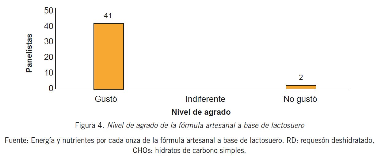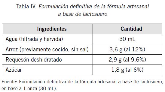 Dado que el propósito principal de esta investigación fue elaborar una fórmula artesanal a base de lactosuero capaz de propiciar la recuperación nutricional de niños en condición de vulnerabilidad y que, además, fuese de sabor agradable y deseable para los consumidores, se consideró la utilización de diferentes alimentos. Se obtuvo como resultado una fórmula completa con preparación óptima, la que puede observarse en la Tabla IV. Ésta constó de 2,9 g de requesón en polvo por cada onza preparada, el cual se deja rehidratar en 30 mL de agua fría o a temperatura ambiente (previamente filtrada y hervida). Posteriormente a ello, la dilución se pasa a la licuadora con 3,6 g de arroz previamente cocido y 1,8 g de azúcar y se licúa hasta obtener una mezcla homogénea (tiempo aproximado 1 min).