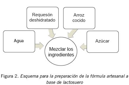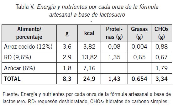 Los cálculos de calorías se establecieron relacionando la cantidad en gramos de cada macronutriente, multiplicados por los coeficientes de Afwater (proteínas 4, grasas 9 e hidratos de carbono 4). Para la estimación de nutrientes de la fórmula artesanal se tomó en consideración el análisis proximal de requesón deshidratado y el contenido de nutrientes del arroz cocido y el azúcar plasmados en la tabla de composición de los alimentos (18).