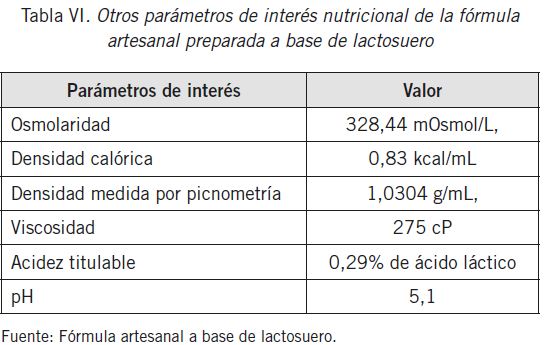 En la Tabla VI se presentan distintos parámetros relacionados con la fórmula a base de lactosuero, que resultan de interés nutricional a la hora de recuperar a un niño en condición de vulnerabilidad. En el caso de la osmolaridad, la bebida artesanal arrojó como resultado 328,44 mOsmol/L y se la clasificó como una fórmula “isoosmolar”. En lo referente a la densidad calórica, ésta fue de 0,83 kcal por cada mL de fórmula preparada, donde el 22,97% de esas calorías eran aportadas principalmente por las proteínas, por lo que puede referirse a esta fórmula como hipocalórica e hiperproteica. De acuerdo a la concentración de solutos presentes en la solución (densidad determinada por picnometría), su densidad fue de 1,0304 g/mL. La viscosidad de la fórmula artesanal fue de 275 cP, lo que es atribuible a la combinación de alimentos que presenta la fórmula y a la preparación de los mismos. Por último, con respecto a la acidez titulable de la fórmula artesanal, ésta fue de 0,291% de ácido láctico y tenía un pH de 5.1, parámetro que se relaciona con la fermentación inicial a la que fue sometido el suero para obtener la precipitación proteica.