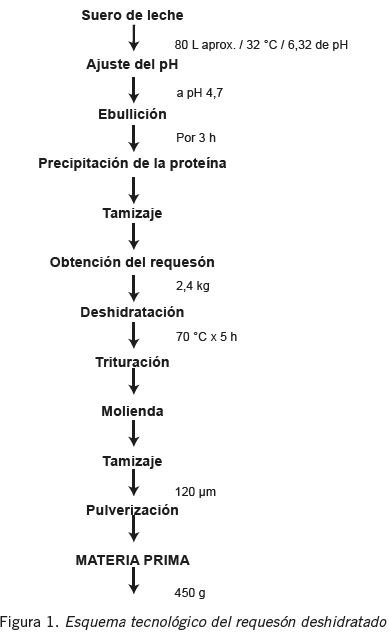 Se partió de aproximadamente 80 L de suero de leche extraídos del primer filtrado, donados por la empresa Lácteos Santa Rosa (Mérida, Venezuela). El primer día de admisión se recibieron aproximadamente 40 L; el lactosuero fue sometido a un proceso de acidificación hasta la obtención de un pH de 4,7 con el agregado de ácido cítrico. Luego fue llevado a ebullición por 3 horas hasta lograr la precipitación proteica. La obtención de la proteína fue tamizada en su totalidad; se descartó la parte líquida y se obtuvieron aproximadamente 200 g de muestra de requesón.