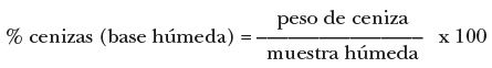 Las cenizas son los residuos inorgánicos que permanecen después de la calcinación o tras la oxidación completa de la materia orgánica (14). Se carboniza la muestra seca utilizada en la determinación de humedad con la ayuda de una hornilla. La carbonización se realiza hasta que cese la liberación de humo, luego se coloca la cápsula con la muestra carbonizada dentro de la mufla. Se incinera a 500–525 °C hasta obtener cenizas libres de carbón. Luego de enfriarse en un desecador se pesa (15).
