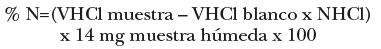VHCl blanco: mL de HCl utilizados en la titulación en blanco.