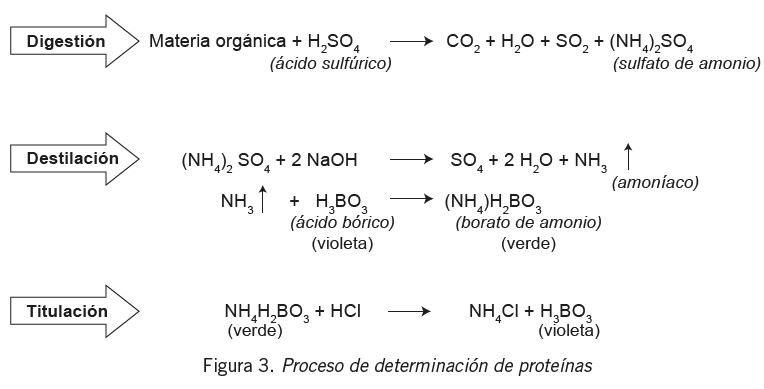 Para la titulación se procede añadiendo una solución fuerte de baja concentración a la solución tampón, como ácido clorhídrico (HCl 0,02 N), hasta que el pH inicial del H3BO3 se restablezca y esto permitirá cuantificar la cantidad de nitrógeno destilado; es decir, la cantidad de HCl necesario para la titulación será proporcional a la cantidad de amoníaco fijado a la solución de H3BO3 y, a la vez, será proporcional a la cantidad de nitrógeno de la muestra (15). El proceso se esquematiza en la Figura 3.