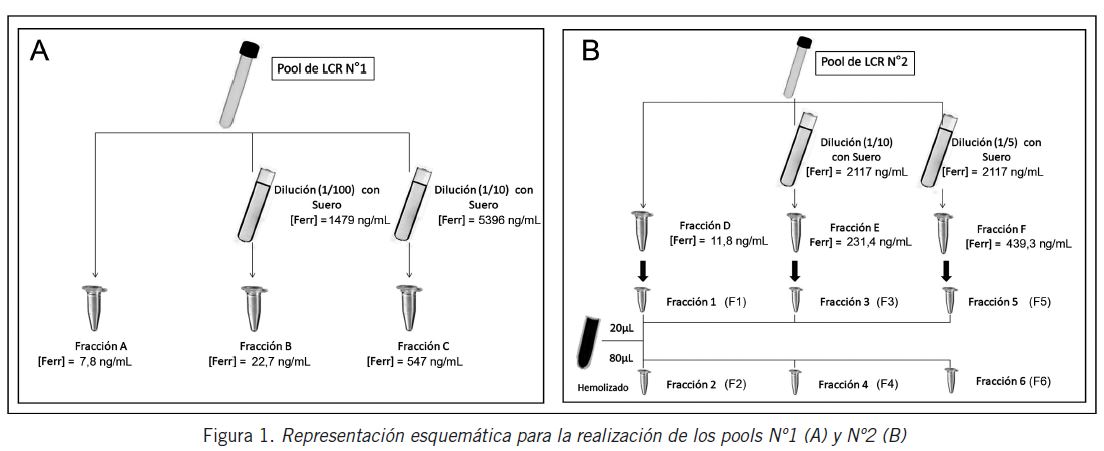Se muestran los flujogramas de preparación de ambos pools (Fig. 1). Con el pool N°1 de LCR se realizaron estudios de precisión, veracidad, linealidad, recuperación y estabilidad; para ello se fraccionaron en 3 alícuotas (A, B y C), adicionando concentraciones conocidas y elevadas de ferritina sérica a las fracciones B y C (Tabla I).