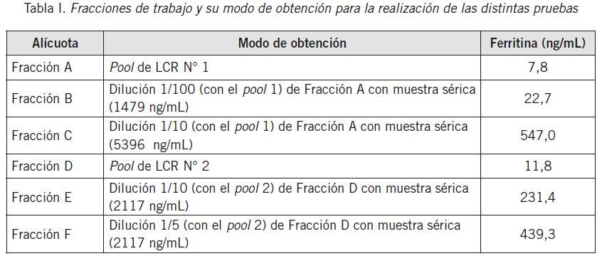 Por otro lado, para realizar estudios de contaminación por arrastre e interferencia por hemólisis, interferencia por bilirrubina y LoD, se utilizó un segundo pool (N° 2) de LCR a partir del cual se generaron tres fracciones (D, E y F) con diferentes concentraciones de ferritina (Fig. 1) (Tabla I). Para obtener el valor verdadero se realizaron 20 determinaciones y se analizaron la media y la desviación estándar. Todas estas fracciones se almacenaron a -20 °C hasta su procesamiento.