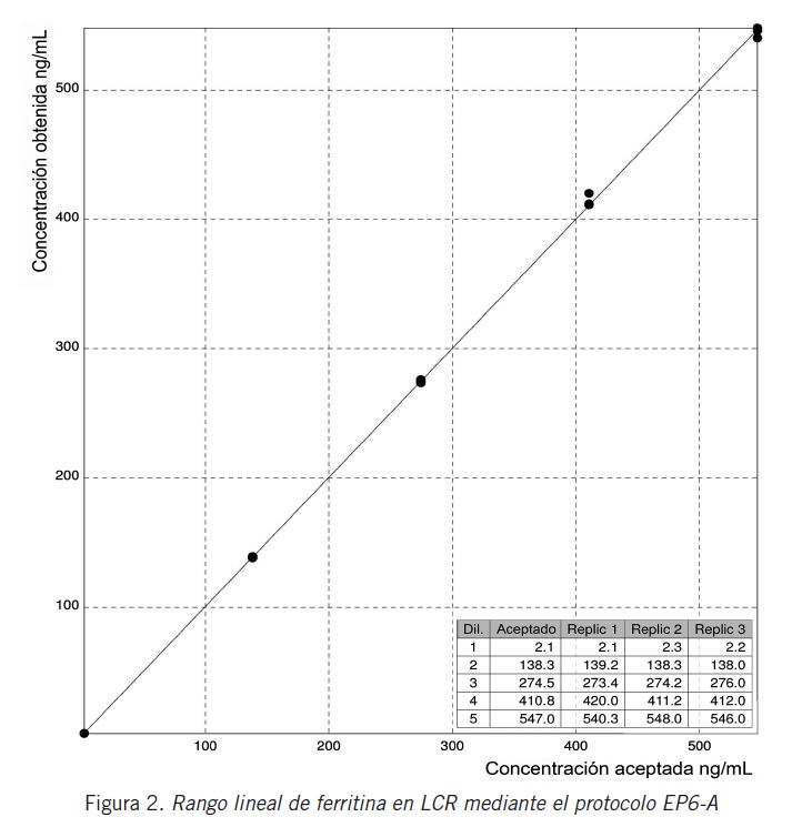 Se determinó a partir del protocolo de la guía EP6-A del CLSI (21), en donde se realizaron diluciones del pool C utilizando el pool A (dilución ¼ con agua ultrapura tipo1), y de esta manera se obtuvieron diluciones seriadas de la muestra más concentrada. A cada alícuota se le determinó por triplicado el valor de ferritina en LCR.