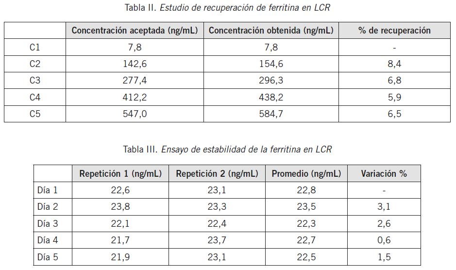 Criterio de aceptación: detección de ferritina en LCR en el rango propuesto según ETa% en el 95% de las determinaciones (24).