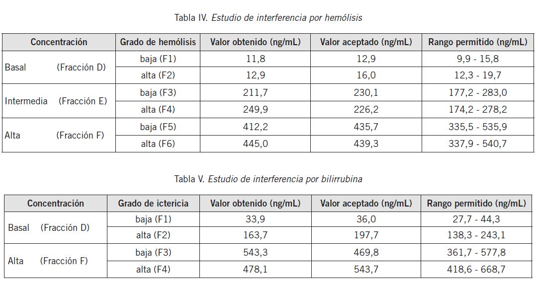 No se evidenció interferencia por hemólisis hasta una concentración de hemoglobina en el rango de 300-500 mg/dL utilizando como requisito de calidad el EA. Los datos pueden observarse en la Tabla IV.