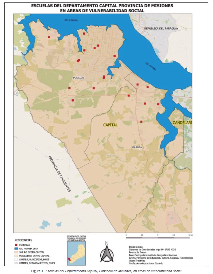 Se diseñó un estudio descriptivo observacional y transversal, en adolescentes escolarizados de los dos últimos años del nivel primario y de los dos primeros del nivel secundario, de establecimientos educacionales donde concurrían adolescentes de familias residentes en barrios identificados como socialmente vulnerables, de las localidades de Posadas y Garupá (Departamento Capital de Misiones), entre mayo de 2015 y junio de 2016. Se incluyeron jóvenes de entre 11 y 19 años de 19 establecimientos de ambas localidades. En la Figura 1 se muestran las escuelas del Departamento Capital, Provincia de Misiones, incluidas en el estudio.