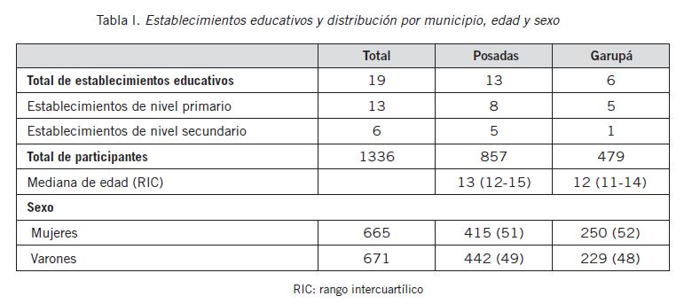 En el estudio participaron 1336 adolescentes escolarizados del Departamento Capital de Misiones que pertenecían a establecimientos escolares de los municipios de Posadas (n=857; 64%) y Garupá (n=479; 36%) (Tabla I).