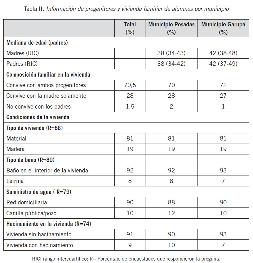 Aunque las áreas geográficas seleccionadas para el estudio eran zonas vulnerables de la periferia de los municipios de Posadas y Garupá, las viviendas donde residían la mayoría de los alumnos participantes (81%) correspondieron a construcciones adecuadas, con baños instalados en el interior de la vivienda y sin hacinamiento. Más del 70% de los alumnos refirieron convivir con ambos progenitores. Estos resultados permitirían estimar que, aunque las áreas geográficas eran socialmente vulnerables, la mayoría de las viviendas de los alumnos participantes eran relativamente apropiadas.