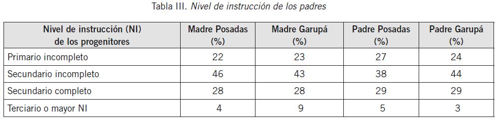 En relación al nivel de instrucción de los padres se observó que 2 de cada 3 padres o madres no habían completado los estudios secundarios. Los resultados mostraron similares proporciones entre madres de ambas localidades y entre madres y padres (Tabla III).