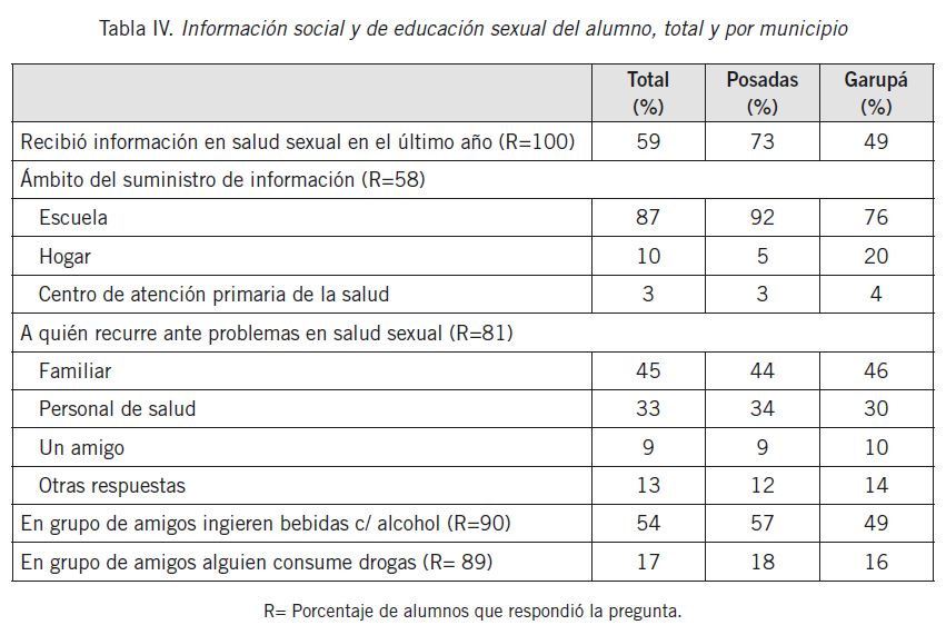 Al analizar la presencia/ausencia de información sobre salud sexual y reproductiva brindada a los adolescentes en el último año anterior a la encuesta, las respuestas afirmativas fueron porcentualmente superiores en Posadas (73%) respecto a Garupá (49%). En ambas localidades la escuela resultó el ámbito de recepción de información citado con mayor frecuencia (Tabla IV). Las respuestas afirmativas fueron más frecuentes para la pregunta acerca de si “su grupo de amigos ingieren alcohol” respecto a si “en su grupo de amigos alguien consume drogas”; similares porcentajes se registraron en ambos municipios en cada pregunta.
