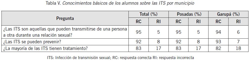 Diversos autores refieren la importancia del conocimiento de los y las adolescentes sobre las formas de protección ante las infecciones de transmisión sexual (2) (3) (5) (6) (7) (8). En un estudio realizado en Colombia, el 39,1% de los estudiantes encuestados manifestaron no tener conocimientos adecuados sobre enfermedades transmitidas sexualmente; en el presente estudio resultó elevada la proporción de alumnos encuestados que respondieron correctamente a preguntas muy simples. Los estudiantes indicaron con mayor frecuencia que fue en el ámbito escolar donde recibieron información sobre salud sexual y reproductiva (9) (10).