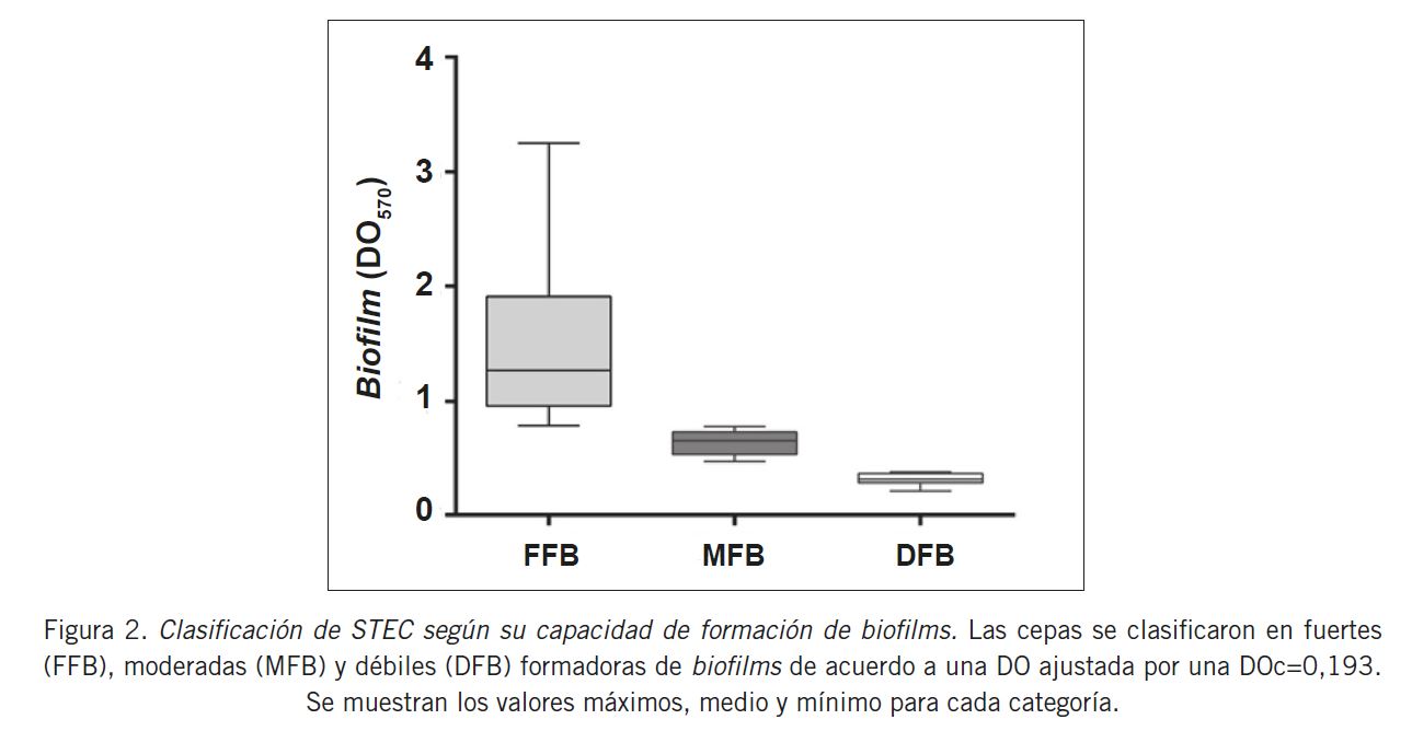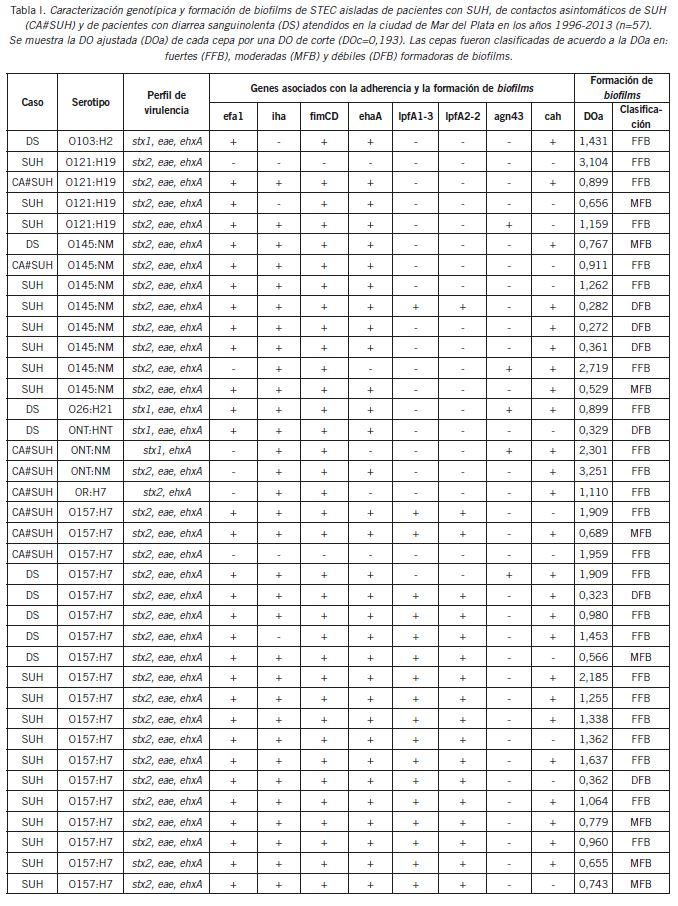 STEC se encuentra altamente asociado al SUH y a otras enfermedades; el serotipo O157:H7 es el más implicado en enfermedades, aunque en los últimos años se han aislado serotipos de STEC no-O157 de casos y brotes esporádicos de diarrea y SUH (32). La capacidad de STEC de formar biofilms en los alimentos o en diferentes superficies, podría conducir a la contaminación cruzada y a la transmisión del patógeno desde el medio ambiente hasta el ser humano provocando enfermedad. Por eso, este trabajo estuvo orientado a la caracterización genética de cepas STEC aisladas de casos clínicos de la ciudad de Mar del Plata y a la evaluación de su capacidad de formar biofilms.