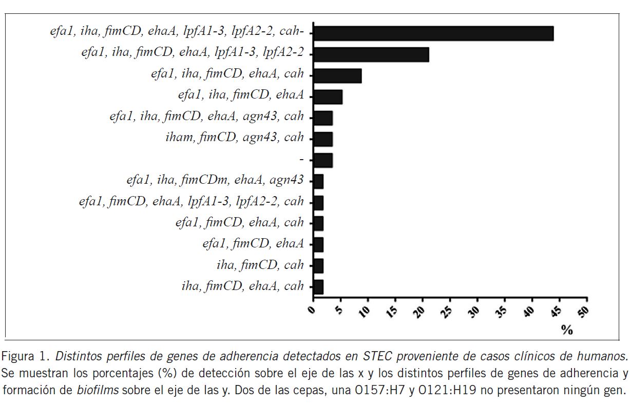 El 96,5% de las cepas STEC eran portadoras del gen eae asociado a la producción de intimina y en la mayoría se detectó la presencia de uno o más de los genes codificantes de factores de adherencia y colonización: efa, iha, fimCD, ehaA, agn43, cah, lpfA1-3 y lpfA2-2. Estos genes codifican proteínas implicadas en la adherencia y la autoagregación celular necesarias para colonizar al hospedador y formar biofilms (33) (34).