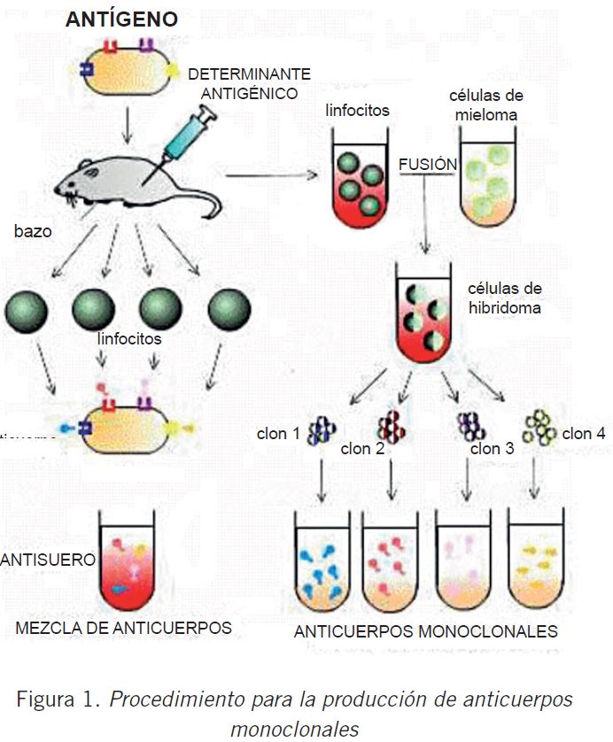 En la Figura 1 se muestra esquemáticamente cómo es el procedimiento para la producción de anticuerpos monoclonales. Brevemente, se inmuniza un ratón con el antígeno que nos interesa (microorganismo, partes de él, componentes purificados, etc.) hasta lograr un buen título de anticuerpos específicos en el suero del animal. Logrado esto, unos pocos días antes de llevar a cabo la hibridación, se realiza una última inoculación de una baja dosis de antígeno, “dosis de llamada”, para aumentar la respuesta. Mientras tanto, se crecen en cultivo células del mieloma adaptadas para duplicarse indefinidamente en ese medio, que tienen intacta su maquinaria de producción y secreción de inmunoglobulinas, pero carecen de la posibilidad de codificar anticuerpos. Estas células de mieloma, al fusionarse (mediante el agregado de un compuesto capaz de aumentar la interacción célula-célula, tal como el polietilenglicol) con las células productoras de anticuerpos provenientes del bazo del animal inmunizado, adquieren de esos linfocitos la propiedad de codificar el anticuerpo producto de la inmunización, producirlo y secretarlo al medio. Estas células fusionadas se denominan “hibridomas” (Fig. 1).