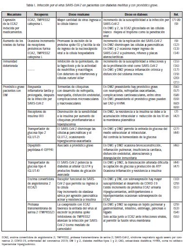 En la Tabla I, se consideran algunos aspectos resaltantes de los mecanismos bioquímicos y de los receptores descriptos en los pacientes diabéticos con COVID-19.